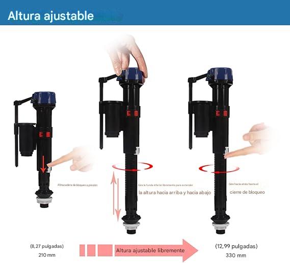 - Altura Ajustable: El cuerpo de la válvula se puede regular telescópicamente, generalmente entre 8.25" y 12.25" (aprox. 21 a 31 cm) para adaptarse a distintos tamaños de tanque.